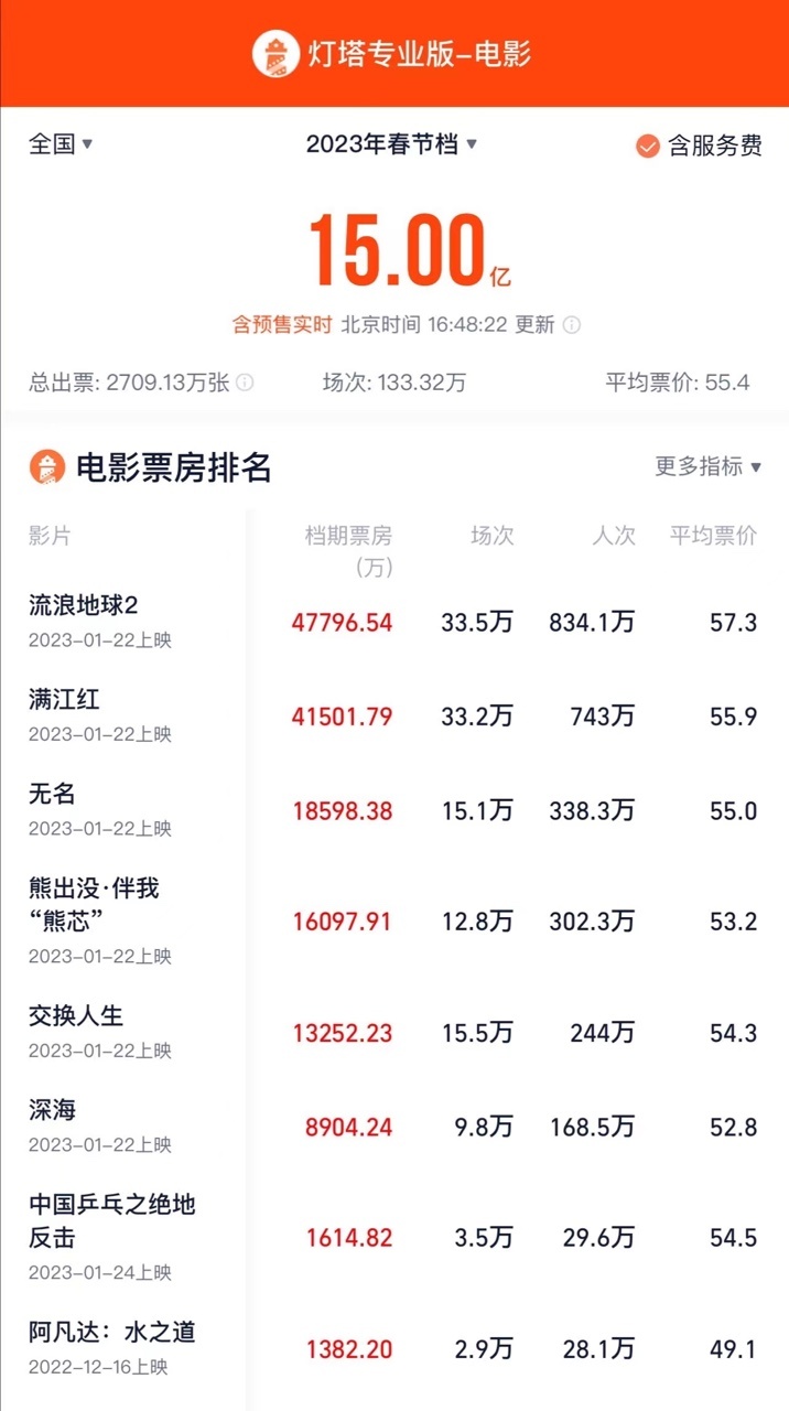 新京报讯(记者 周慧晓婉)据灯塔专业版实时数据,1月22日16时48分,2023年春节档(1月21日-1月27日)总票房(含预售)突破15亿。单片方面,《流浪地球2》《满江红》档期票房均超过4亿。